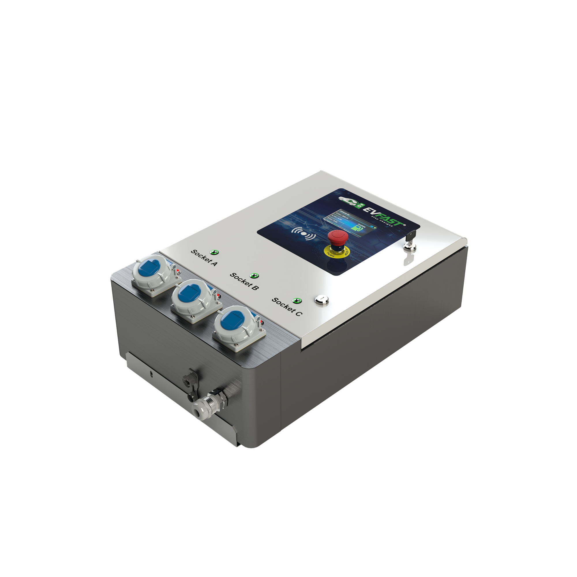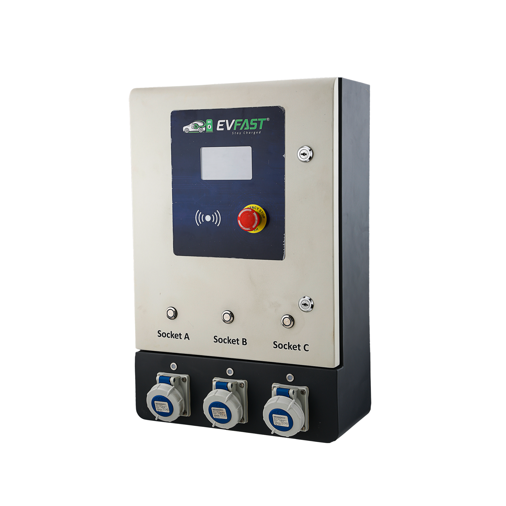EVFAST BHARAT AC001 (ARAI APPROVED) 10kW AC EV Charger (3.3 kW × 3) is a smart, multi-output EV charging solution designed to charge up to three electric vehicles simultaneously. Each output delivers 3.3 kW AC power through industrial-grade sockets, ensuring reliable, safe, and flexible charging using portable EV charging cables.