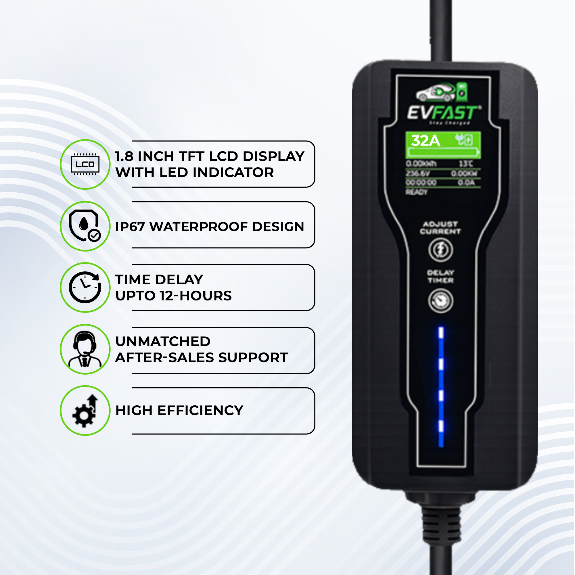 Power your EV up to twice as fast with the EVFAST 7.4kW Portable EV Charger. Designed for fast, safe, and reliable charging, this advanced 7.4kW AC fast charger is compatible with leading EV brands,making it a perfect solution for home and travel charging needs.The 12-hour timer reservation lets you schedule charging during off-peak hours for better energy efficiency.