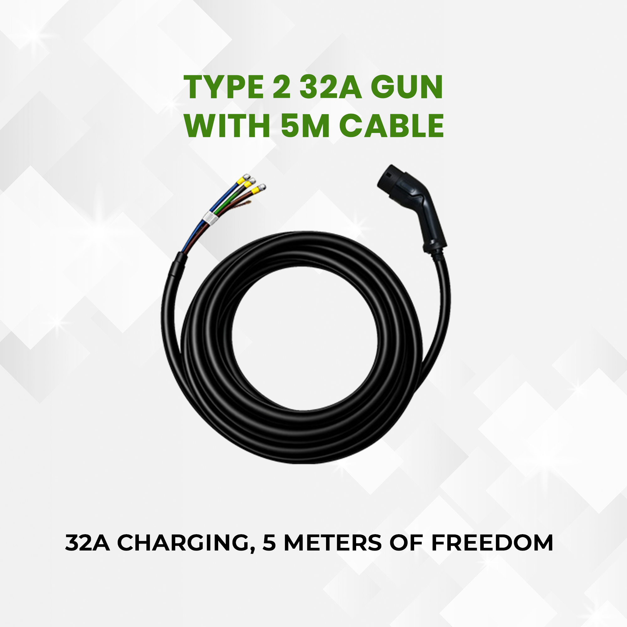 Rated for 32A single-phase charging, the connector supports higher power transfer for faster charging compared to standard 16A solutions. The 5-metre heavy-duty cable provides flexibility and ease of use, allowing convenient vehicle positioning during charging.