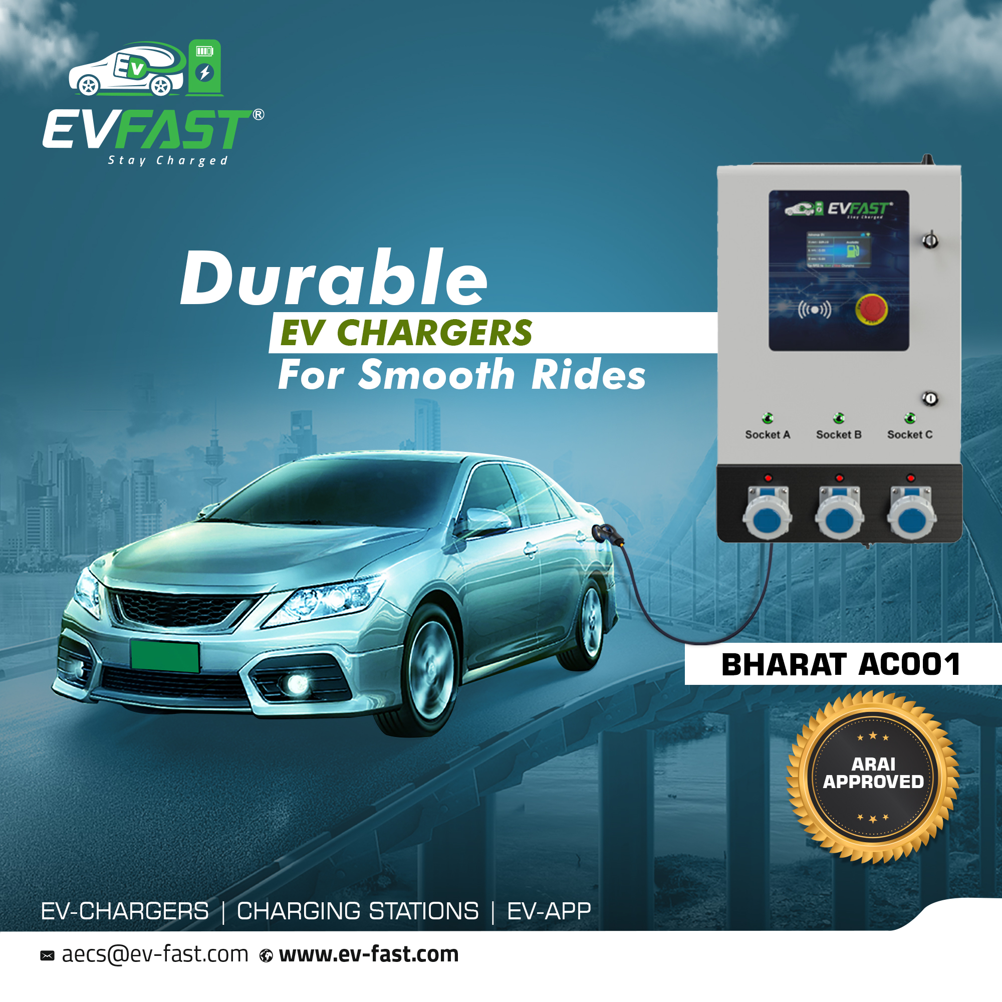 EVFAST BHARAT AC001 (ARAI APPROVED) 10kW AC EV Charger (3.3 kW × 3) is a smart, multi-output EV charging solution designed to charge up to three electric vehicles simultaneously. Each output delivers 3.3 kW AC power through industrial-grade sockets, ensuring reliable, safe, and flexible charging using portable EV charging cables.